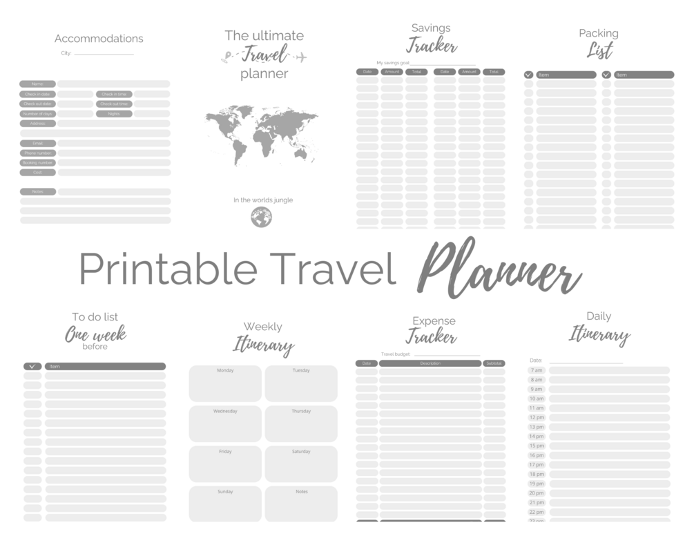 Printable digital travel planner I Vacation planner I Trip Itinerary I Travel journal I Instant download I A4 I Grey