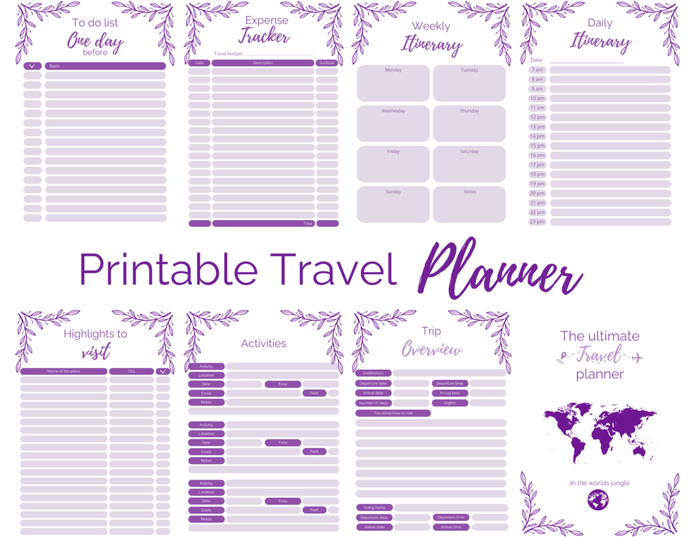 Printable digital travel planner I Vacation planner I Trip Itinerary I Travel journal I Instant download I A4 I Purple