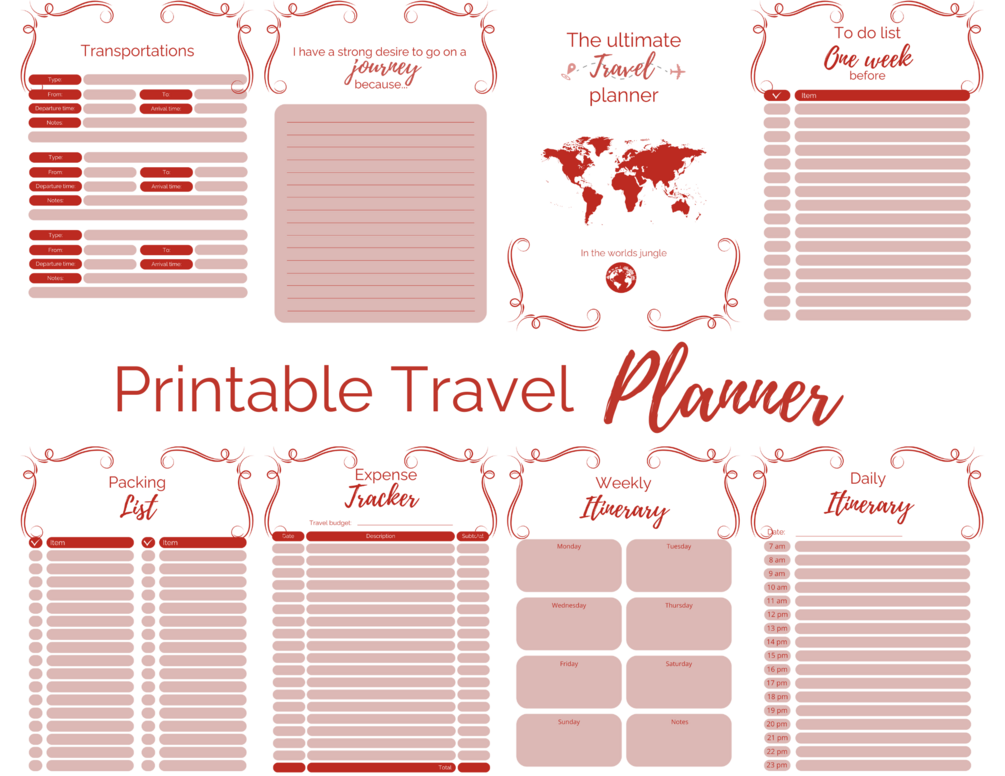 Printable digital travel planner I Vacation planner I Trip Itinerary I Travel journal I Instant download I A4 I Red